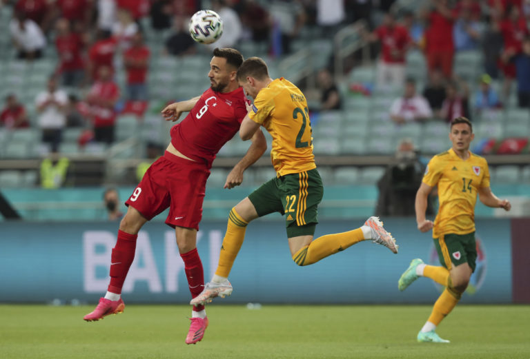 Turecký reprezentant Kenan Karaman v hlavičkovom súboji s Chrisom Mephamom počas zápasu A-skupiny na ME vo futbale 2020. Baku (Olympijský štadión), 16. jún 2021. Foto: Tolga Bozoglu/Pool Photo via AP.