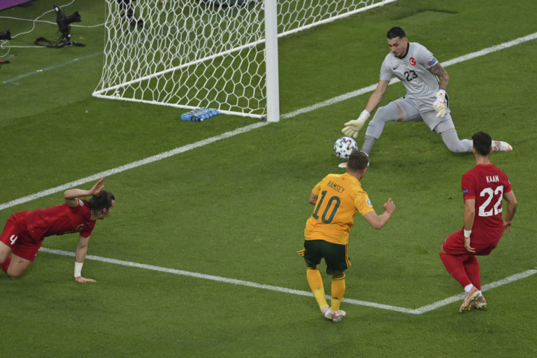 Zákrok tureckého gólmana Ugurcana Cakira po zakončení Walesana Aarona Ramseyho počas zápasu A-skupiny na ME vo futbale 2020. Baku (Olympijský štadión), 16. jún 2021. Foto: Dan Mullan/Pool via AP.