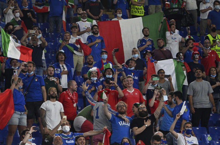 Fanúšikovia pred zápasom A-skupiny na ME vo futbale medzi Talianskom a Švajčiarskom. Rím (Olympijský štadión), 16. jún 2021. Foto: Andreas Solaro/Pool Photo via AP.