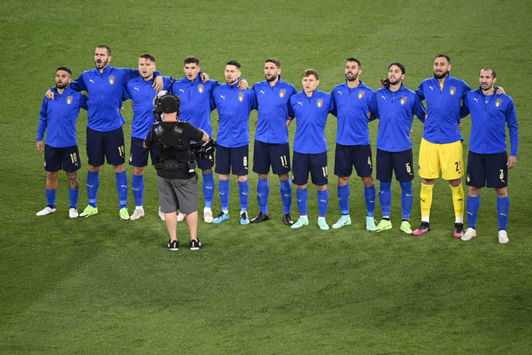 Reprezentanti Talianska pred zápasom A-skupiny na ME vo futbale 2020 proti Švajčiarsku. Rím (Olympijský štadión), 16. jún 2021. Foto: SITA/AP.