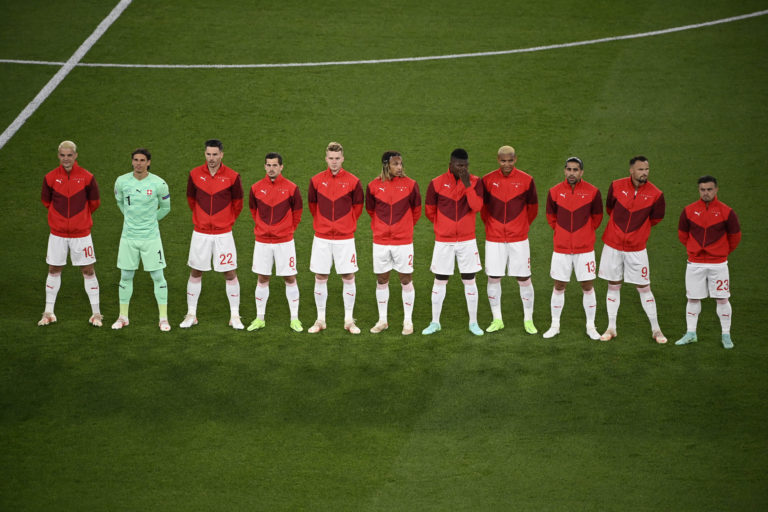 Reprezentanti Švajčiarska pred zápasom A-skupiny ME vo futbale 2020 proti Taliansku. Rím (Olympijský štadión), 16. jún 2021. Foto: SITA/AP.
