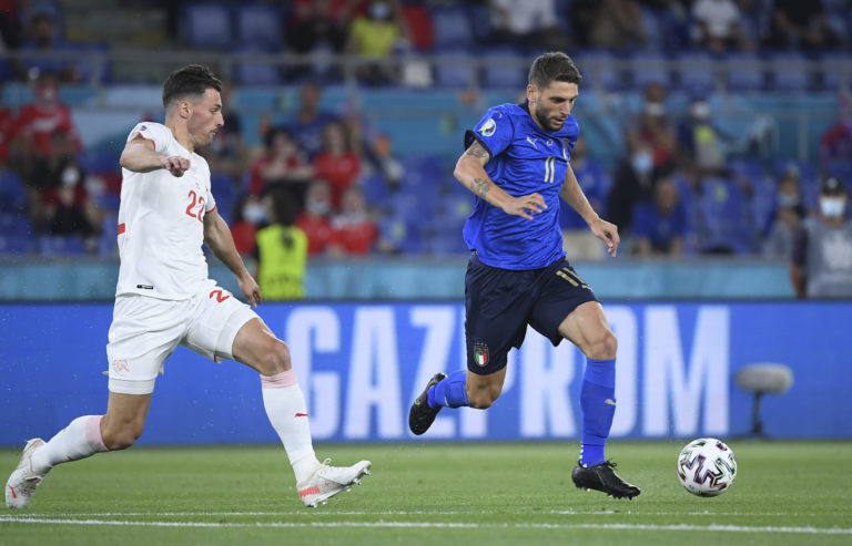 Zľava: Švajčiarsky reprezentant Fabian Schär a Talian Domenico Berardi počas zápasu A-skupiny na ME vo futbale 2020. Rím (Olympijský štadión), 16. jún 2021. Foto: Ettore Ferrari, Pool via AP.