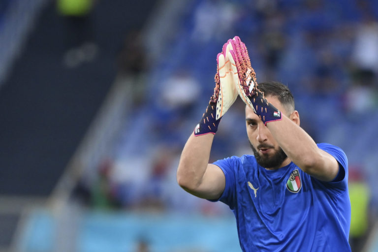 Taliansky gólman Gianluigi Donnarumma pred zápasom proti Švajčiarsku na ME vo futbale 2020. Rím (Olympijský štadión), 16. jún 2021. Foto: Alfredo Falcone/LaPresse via AP.