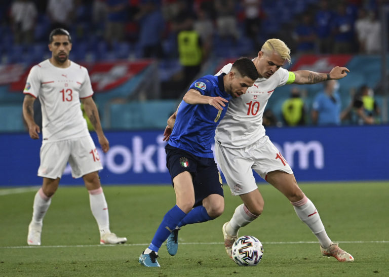 Švajčiarsky reprezentant Granit Xhaka v súboji s Talianom Jorginhom počas zápasu A-skupiny na ME vo futbale 2020. Rím (Olympijský štadión), 16. jún 2021. Foto: Andreas Solaro/Pool Photo via AP