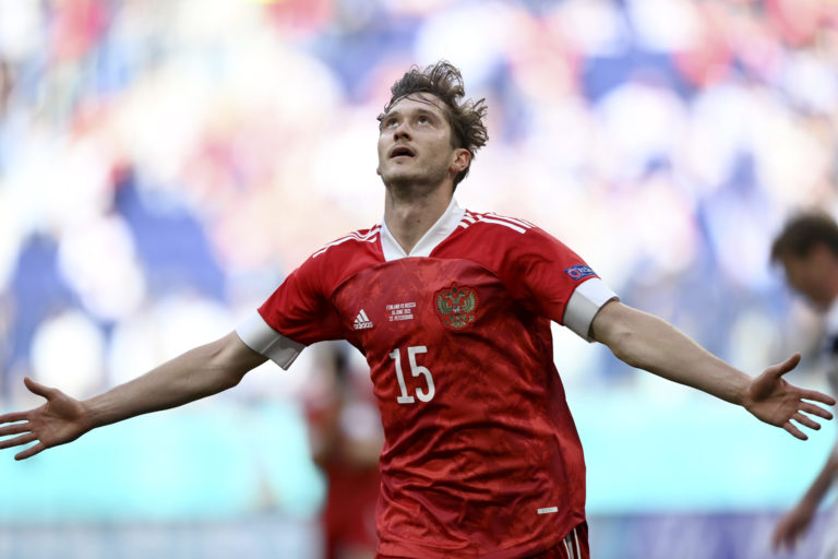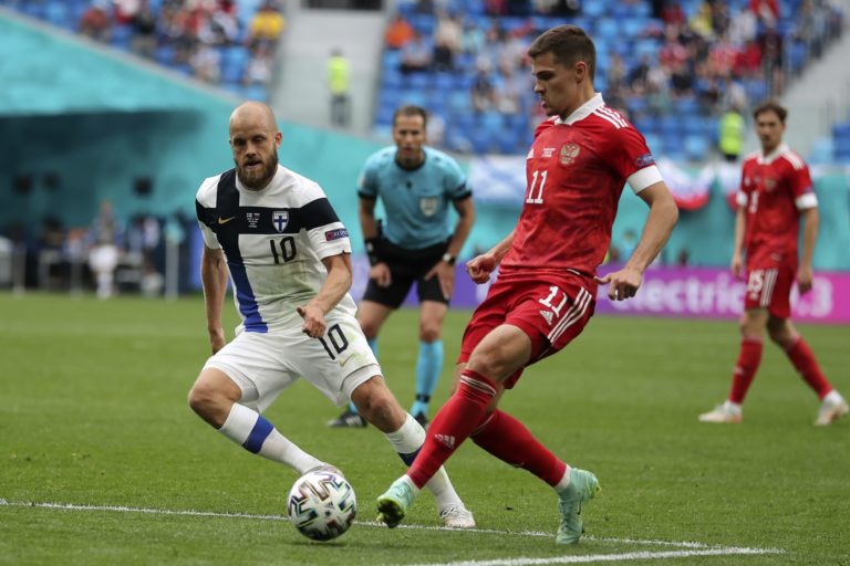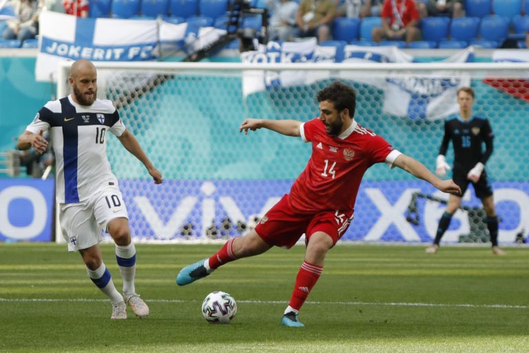 Ruský futbalista Roman Zobnin (vpravo) a fínsky futbalista Teemu Pukki počas zápasu B-skupiny na ME vo futbale 2020. Petrohrad, 16. jún 2021. Foto: SITA/AP