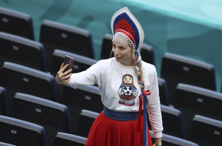 Ruská fanúšička počas zápasu B-skupiny na ME vo futbale 2020. Petrohrad, 16. jún 2021. Foto: SITA/AP