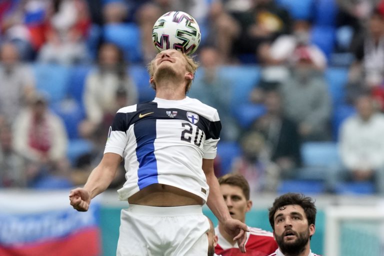 Fínsky futbalista Joel Pohjanpalo počas zápasu B-skupiny na ME vo futbale 2020. Petrohrad, 16. jún 2021. Foto: SITA/AP