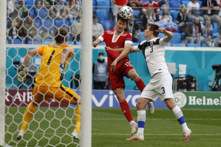 Ruský futbalista Aleksei Miranchuk (uprostred) sa snaží hlavičkou streliť gól do fínskej brány počas zápasu B-skupiny na ME vo futbale 2020. Petrohrad, 16. jún 2021. Foto: SITA/AP