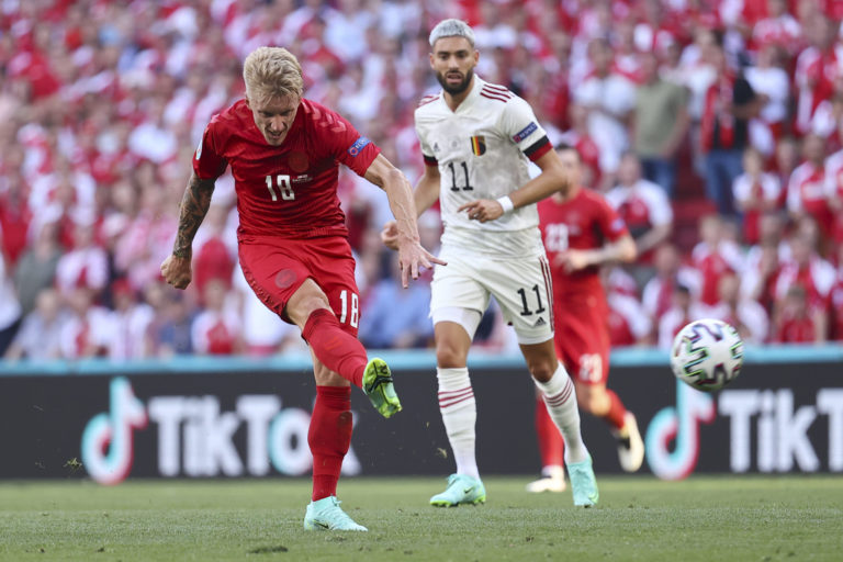 Daniel Wass z Dánska (vľavo) strieľa loptu počas zápasu B-skupiny na ME vo futbale 2020 proti Belgicku. Kodaň, 17. jún 2021. Foto: SITA/AP