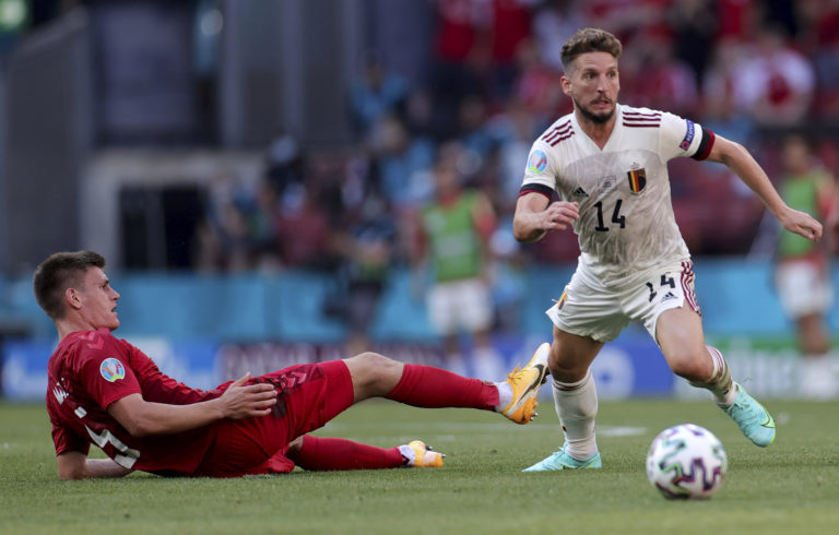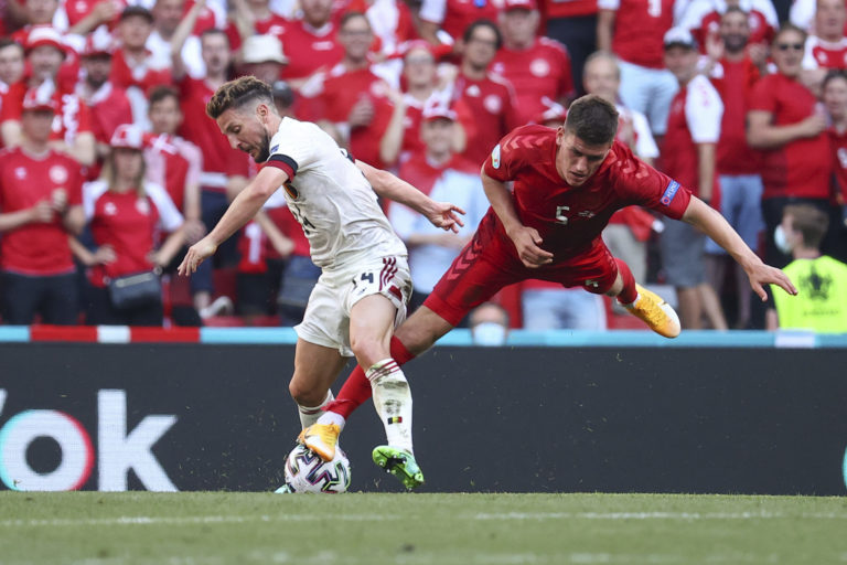 Dries Mertens z Belgicka (vľavo) a Joakim Maehle z Dánska počas zápasu B-skupiny na ME vo futbale 2020. Kodaň, 17. jún 2021. Foto: SITA/AP