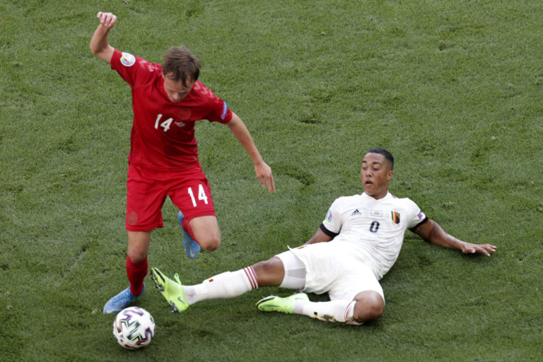 Youri Tielemans z Belgicka sa snaží vypichnúť loptu Mikkelovi Damsgaardovi z Dánska počas zápasu B-skupiny na ME vo futbale 2020. Kodaň, 17. jún 2021. Foto: SITA/AP