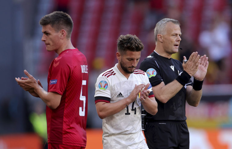 Hráči a rozhodca aplaudujú dánskemu futbalistovi Christianovi Eriksenovi v 10. minúte zápasu B-skupiny na ME vo futbale 2020 medzi Dánskom a Belgickom. Kodaň, 17. jún 2021. Foto: SITA/AP