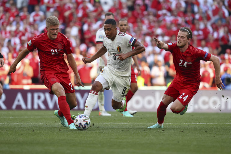 Youri Tielemans z Belgicka (v strede) sa snaží presadiť medzi hráčmi Dánska počas zápasu B-skupiny na ME vo futbale 2020. Kodaň, 17. jún 2021. Foto: SITA/AP