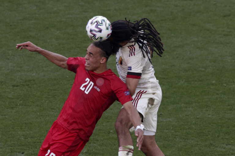 Yussuf Poulsen z Dánska (vľavo) a Jason Denayer z Belgicka v hlavičkovom súboji počas zápasu B-skupiny na ME vo futbale 2020. Kodaň, 17. jún 2021. Foto: SITA/AP