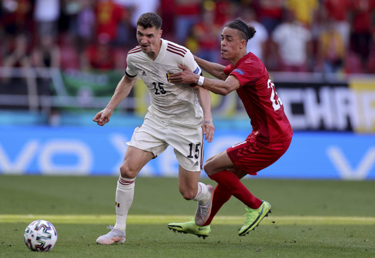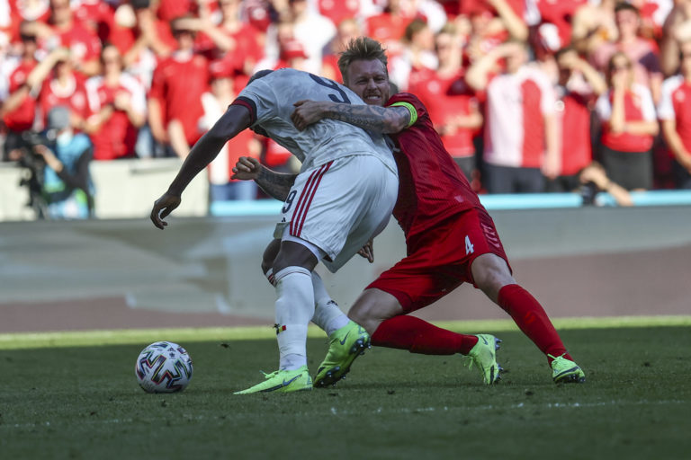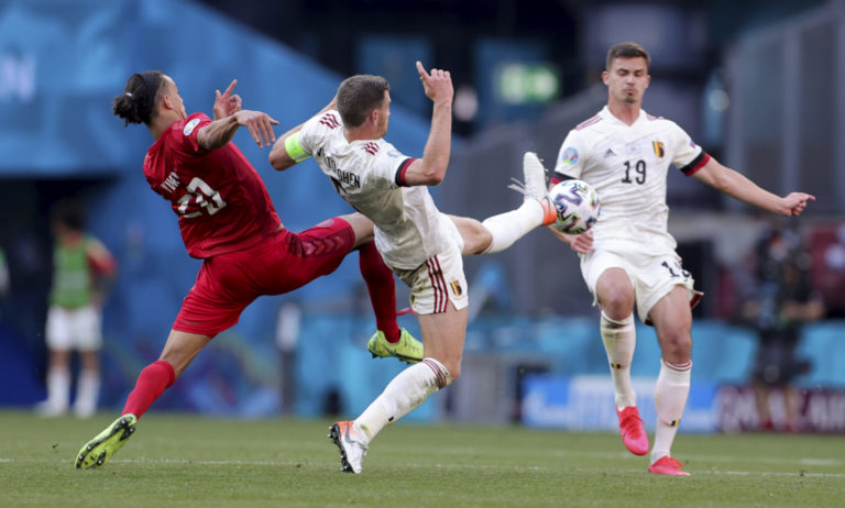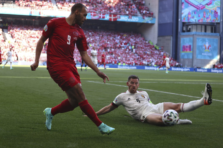 z Belgicka (vpravo) blokuje prihrávku Martina Braithwaita z Dánska počas zápasu B-skupiny na ME vo futbale 2020. Kodaň, 17. jún 2021. Foto: SITA/AP