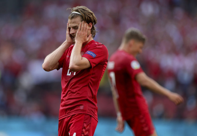 Reakcia Mathiasa Jensena z Dánska počas zápasu B-skupiny na ME vo futbale 2020 proti Belgicku. Kodaň, 17. jún 2021. Foto: SITA/AP