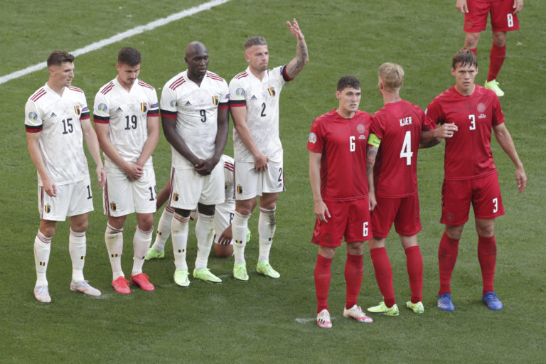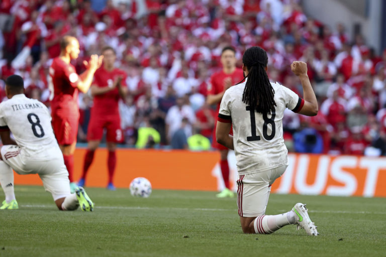 Jason Denayer z Belgicka kľačí pred začiatkom zápasu B-skupiny na ME vo futbale 2020 proti Dánsku. Kodaň, 17. jún 2021. Foto: SITA/AP