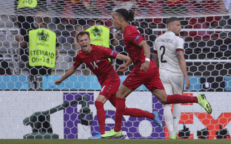 Yussuf Poulsen z Dánska (vpravo) sa teší z gólu v sieti Belgicka počas zápasu B-skupiny na ME vo futbale 2020. Kodaň, 17. jún 2021. Foto: SITA/AP