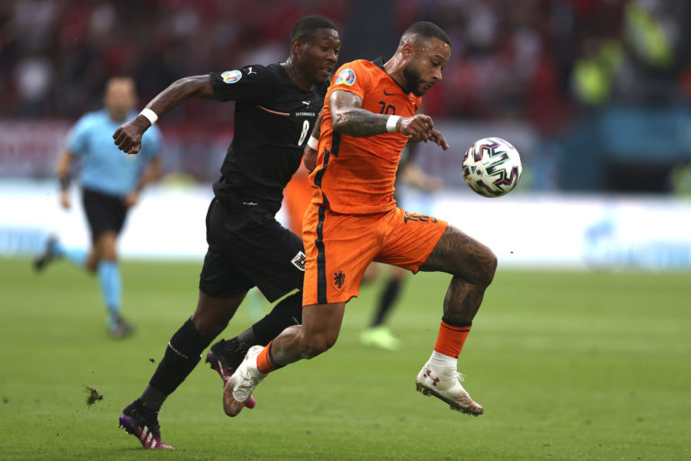 Memphis Depay z Holandska (vpravo) sa snaží skrotiť loptu pred Davidom Alabom z Rakúska počas zápasu C-skupiny na ME vo futbale 2020. Amsterdam, 17. jún 2021. Foto: SITA/AP