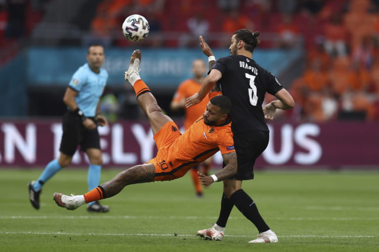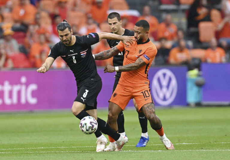 Aleksandar Dragović z Rakúska (vľavo) a Memphis Depay z Holandska bojujú o loptu počas zápasu C-skupiny na ME vo futbale 2020. Amsterdam, 17. jún 2021. Foto: SITA/AP