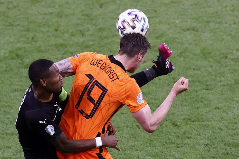 Wout Weghorst z Holandska (vpravo) sa snaží odhlavičkovať loptu pred Davidom Alabom počas zápasu C-skupiny na ME vo futbale 2020. Amsterdam, 17. jún 2021. Foto: SITA/AP