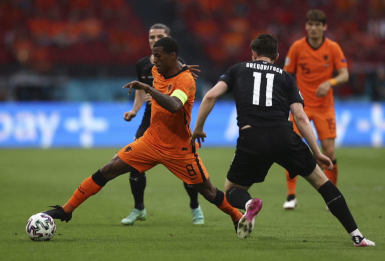 Georginio Wijnaldum z Holandska (vľavo) sa pokúša obísť Michaela Gregoritscha z Rakúska počas zápasu C-skupiny na ME vo futbale 2020. Amsterdam, 17. jún 2021. Foto: SITA/AP