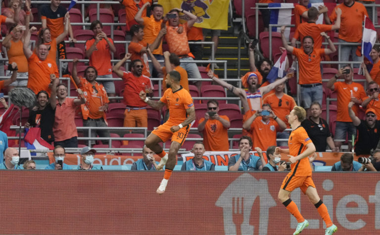 Memphis Depay a holandskí fanúšikovia sa radujú z gólu v sieti Rakúska počas zápasu C-skupiny na ME vo futbale 2020. Amsterdam, 17. jún 2021. Foto: SITA/AP
