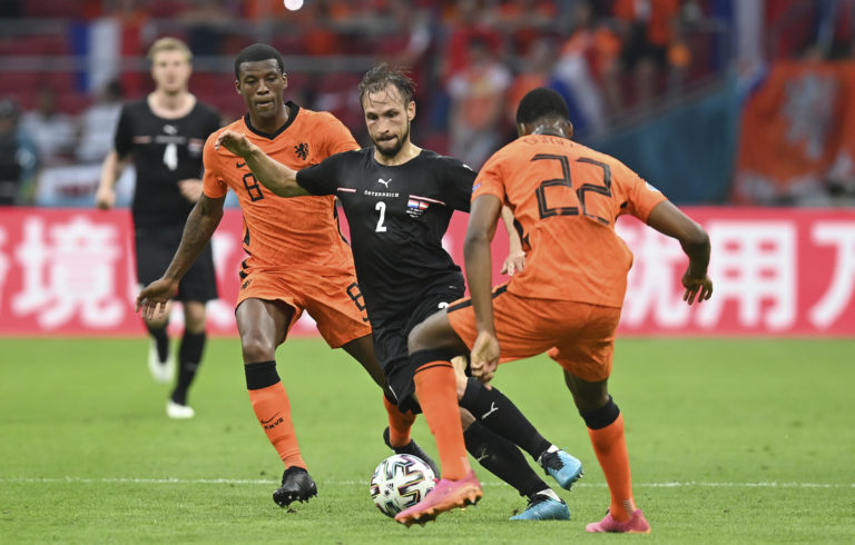 Andreas Ulmer z Rakúska (v strede) kľučkuje medzi hráčmi Holandska počas zápasu C-skupiny na ME vo futbale 2020. Amsterdam, 17. jún 2021. Foto: SITA/AP
