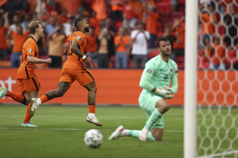 Memphis Depay z Holandska (vľavo) a brankár Rakúska Daniel Bachmann po premenej penalte počas zápasu C-skupiny na ME vo futbale 2020. Amsterdam, 17. jún 2021. Foto: SITA/AP