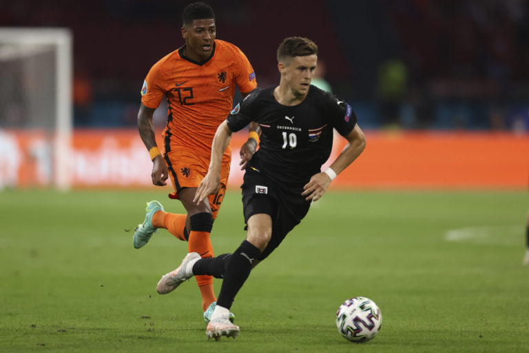 Florian Grillitsch z Rakúska (vpredu) a Patrick van Aanholt z Holandska počas zápasu C-skupiny na ME vo futbale 2020. Amsterdam, 17. jún 2021. Foto: SITA/AP