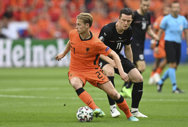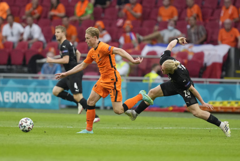 Frenkie de Jong z Holandska (vpredu) a Michael Gregoritsch z Rakúska počas zápasu C-skupiny na ME vo futbale 2020. Amsterdam, 17. jún 2021. Foto: SITA/AP