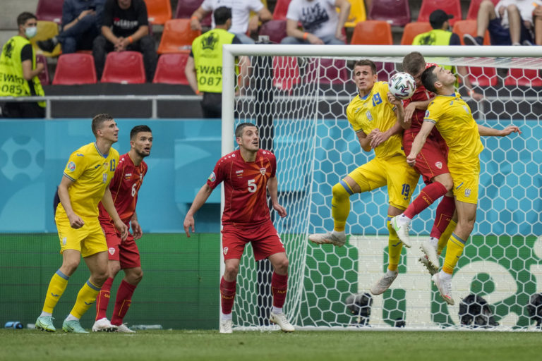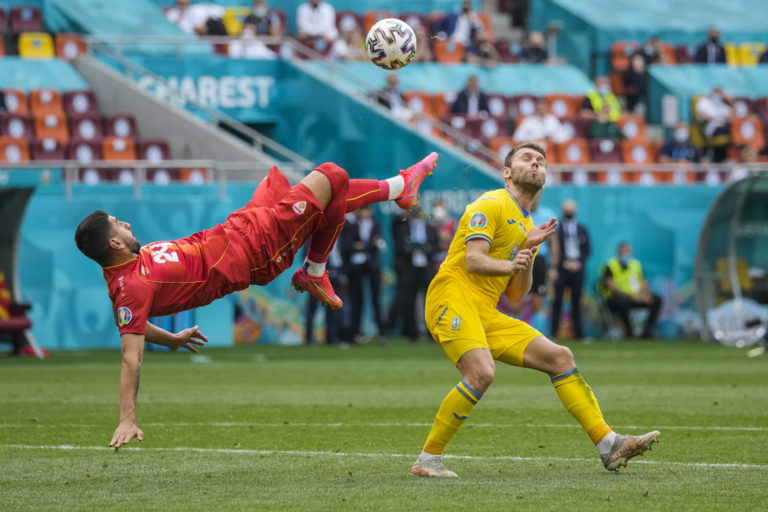 Hráč Severného Macedónska Stefan Ristovski bojuje o loptu počas zápasu C-skupiny na ME vo futbale 2020 proti Ukrajine. Bukurešť, 17. jún 2021. Foto: SITA/AP