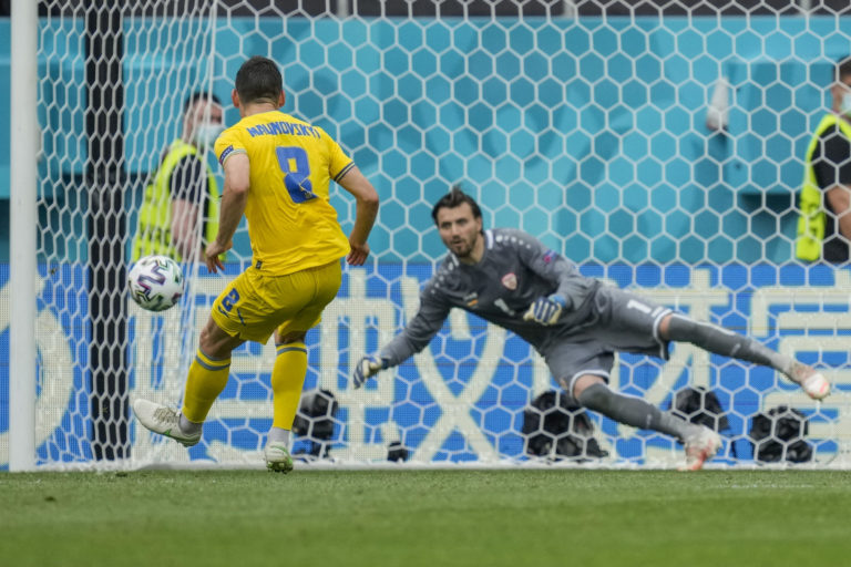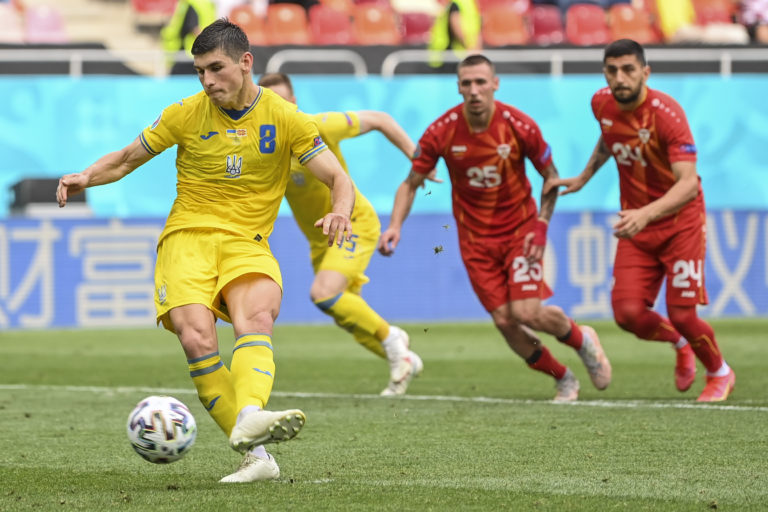 Ukrajinský futbalista Ruslan Malinovskij sa snaží premeniť penaltu počas zápasu C-skupiny na ME vo futbale 2020 proti Severnému Macedónsku. Bukurešť, 17. jún 2021. Foto: SITA/AP