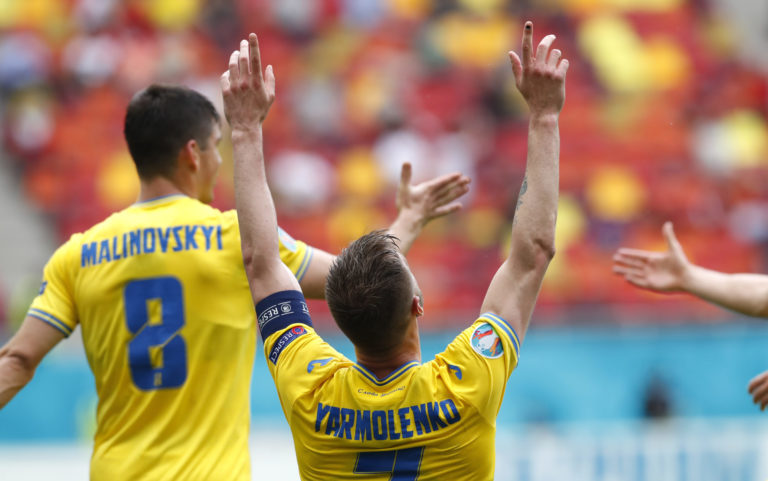 Ukrajinský futbalista Ruslan Malinovskij počas zápasu C-skupiny na ME vo futbale 2020 proti Severnému Macedónsku. Bukurešť, 17. jún 2021. Foto: SITA/AP