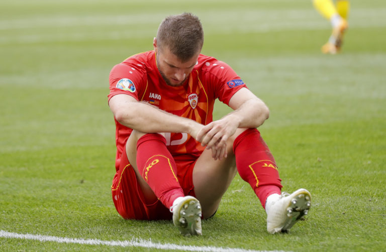 Futbalista Severného Macedónska Stefan Ristovski smúti po prehre s Ukrajinou počas zápasu C-skupiny na ME vo futbale 2020. Bukurešť, 17. jún 2021. Foto: SITA/AP