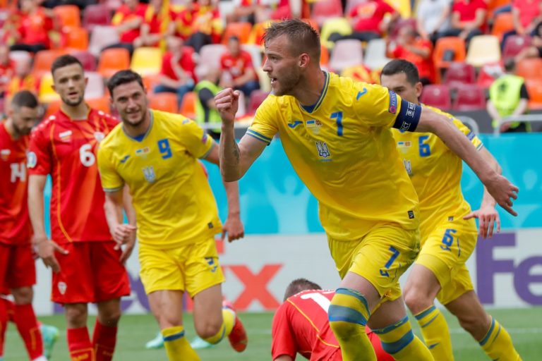 Ukrajinský futbalista Andrij Jarmolenko sa teší po góle do siete Severného Macedónska počas zápasu C-skupiny na ME vo futbale 2020. Bukurešť, 17. jún 2021. Foto: SITA/AP