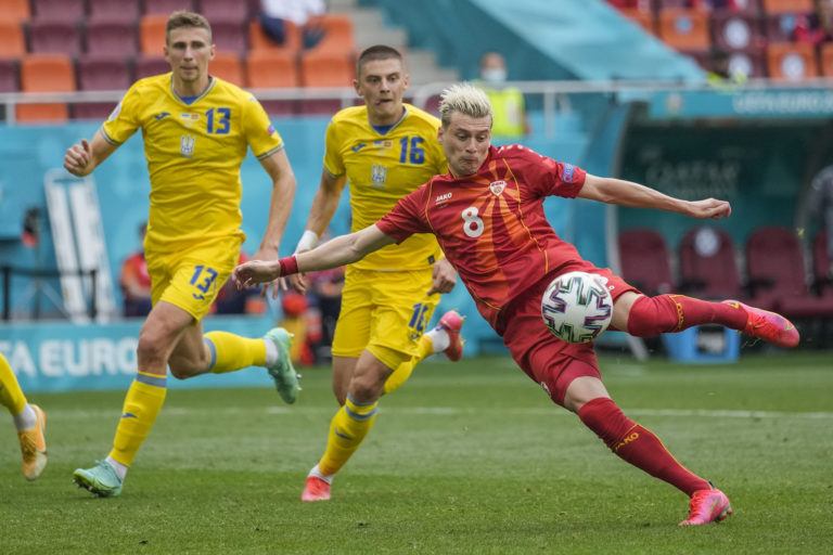 Futbalista Severného Macedónska Ezgjan Alioski počas zápasu C-skupiny na ME vo futbale 2020 proti Ukrajine. Bukurešť, 17. jún 2021. Foto: SITA/AP