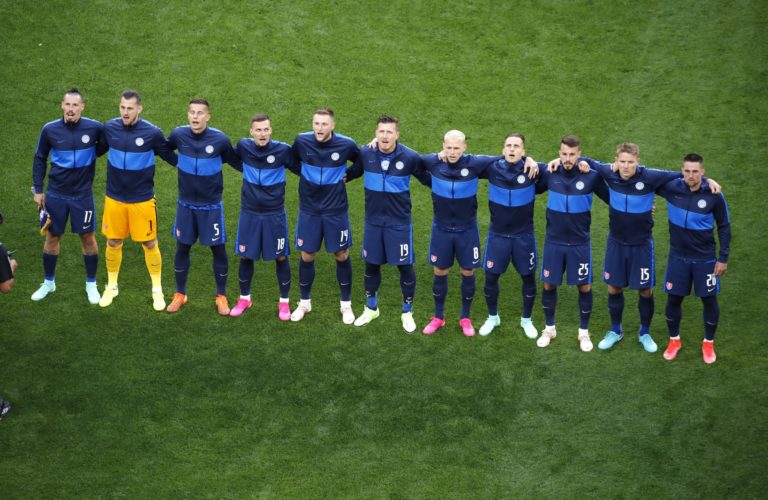 Slovenskí reprezentanti pred zápasom proti Poľsku na ME vo futbale 2020. Petrohrad, 14. jún 2021. Foto: Anton Vaganov/Pool via AP