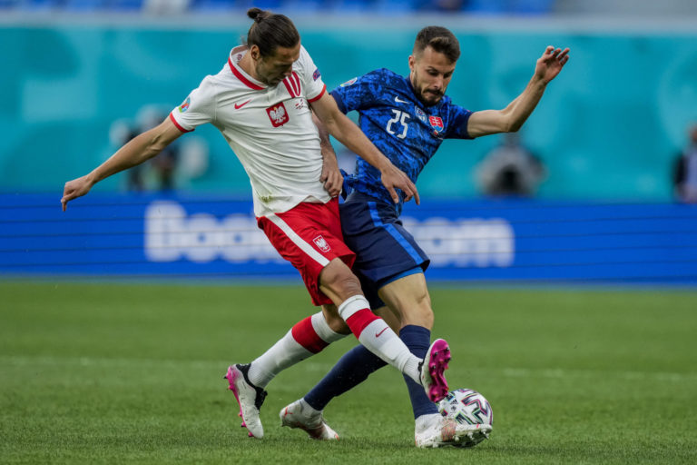 Poľský reprezentant Grzegorz Krychowiak v súboji so Slovákom Jurajom Kuckom počas zápasu na ME vo futbale 2020. Petrohrad, 14. jún 2021. Foto: SITA/AP.