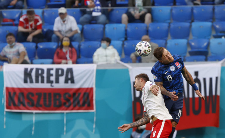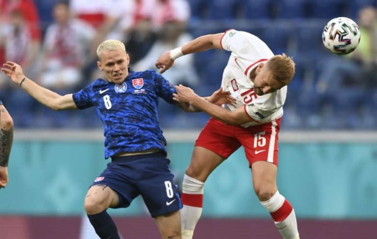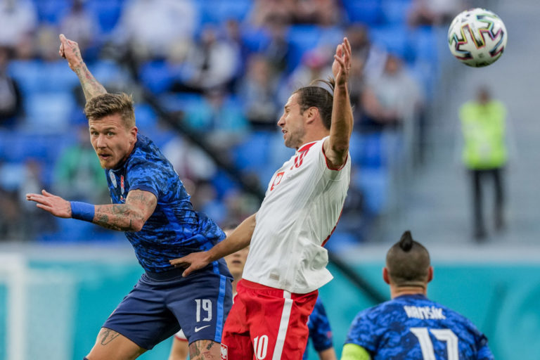 Slovenský reprezentant Juraj Kucka v hlavičkovom súboji s Poliakom Karolom Linettym počas zápasu na ME vo futbale 2020. Petrohrad, 14. jún 2021. Foto: SITA/AP.