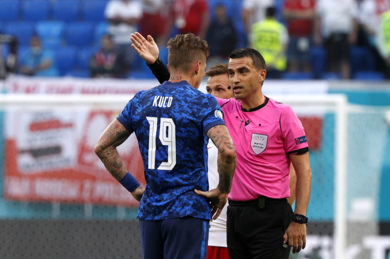 Slovenský reprezentant Juraj Kucka v rozhovore s hlavným rozhodcom počas zápasu proti Poľsku na ME vo futbale 2020. Petrohrad, 14. jún 2021. Foto: Jevgenia Novoženina/Pool via AP.