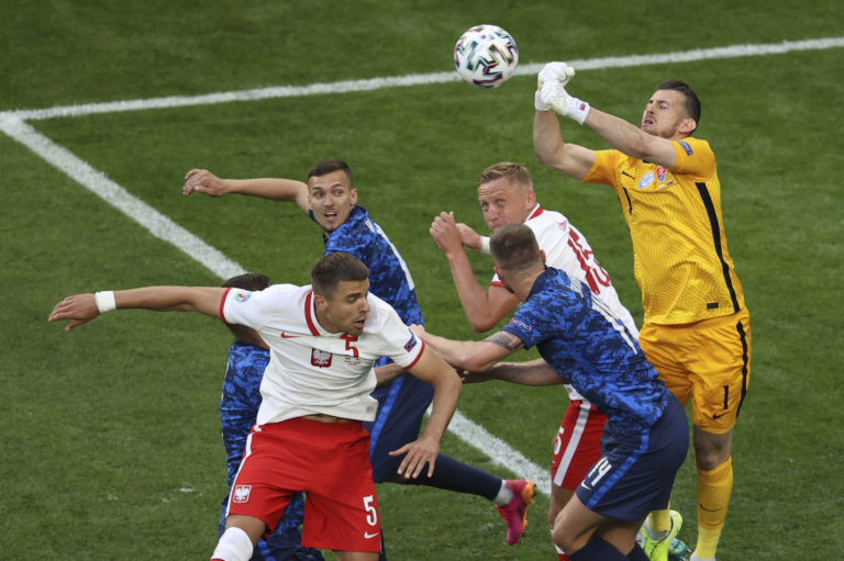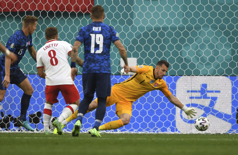 Zákrok slovenského gólmana Martina Dúbravku počas zápasu proti Poľsku na ME vo futbale 2020. Petrohrad, 14. jún 2021. Foto: Anton Vaganov/Pool via AP.