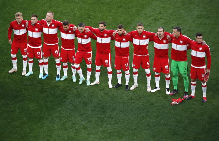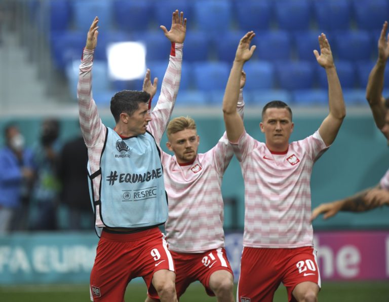 Reprezentanti Poľska pred zápasom proti Slovensku na ME vo futbale 2020. Petrohrad, 14. jún 2021. Foto: Anton Vaganov/Pool via AP.