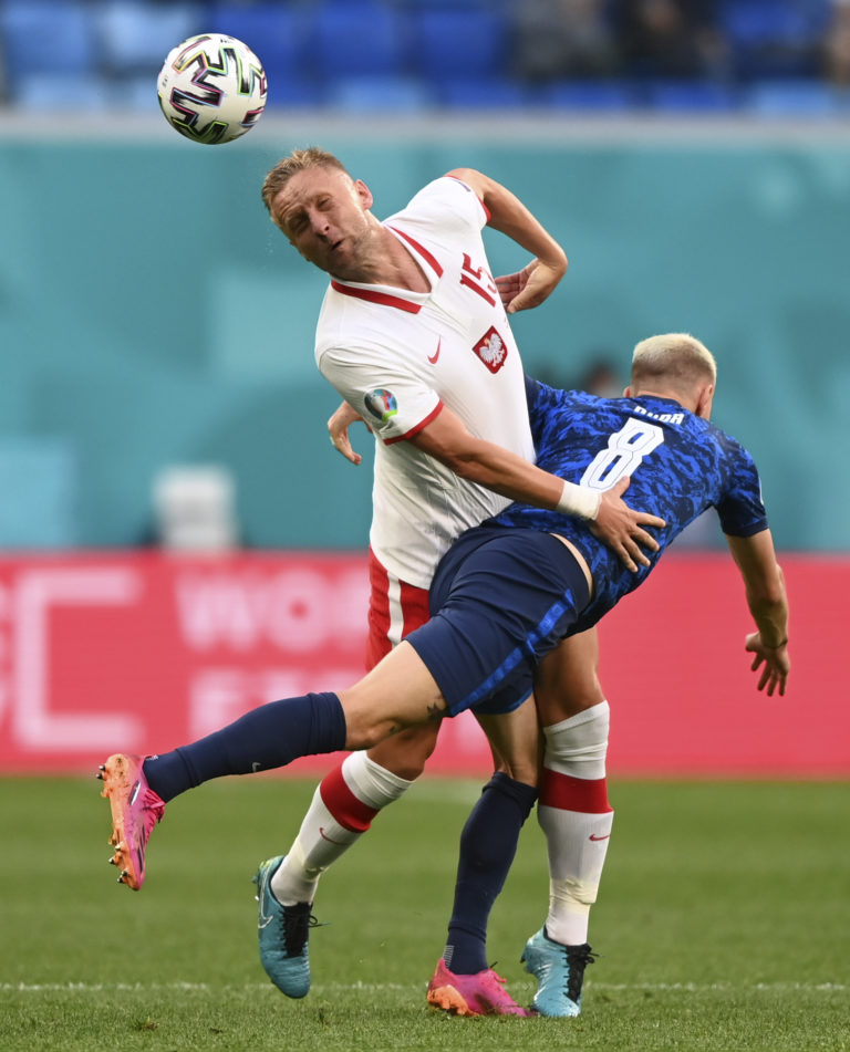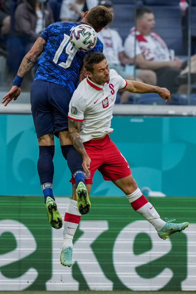 Poľský reprezentant Karol Linetty v hlavičkovom súboji so Slovákom Jurajom Kuckom počas zápasu na ME vo futbale 2020. Petrohrad, 14. jún 2021. Foto: Jevgenia Novoženina/Pool via AP.