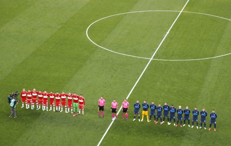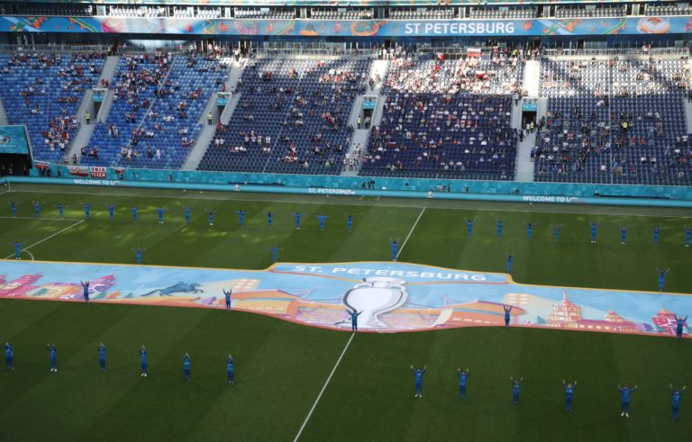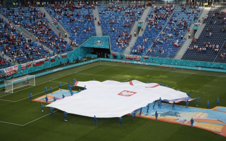 Predzápasový ceremoniál pred duelom Poľsko - Slovensko na ME vo futbale 2020. Petrohrad (Gazprom Arena), 14. jún 2021. Foto: Anton Vaganov/Pool via AP.