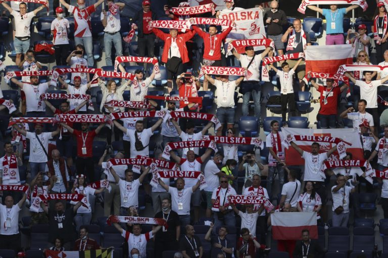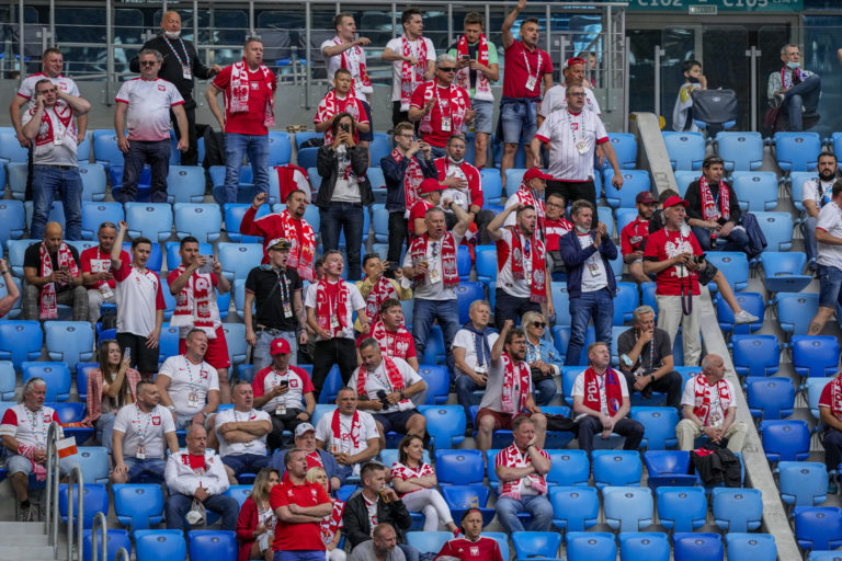 Fanúšikovia počas zápasu Poľsko - Slovensko na ME vo futbale 2020. Petrohrad, 14. jún 2021. Foto: Anton Vaganov/Pool via AP.