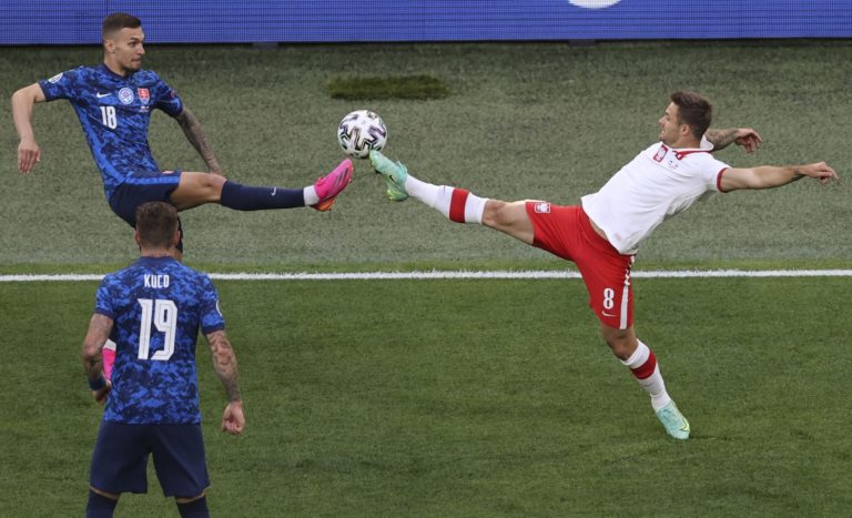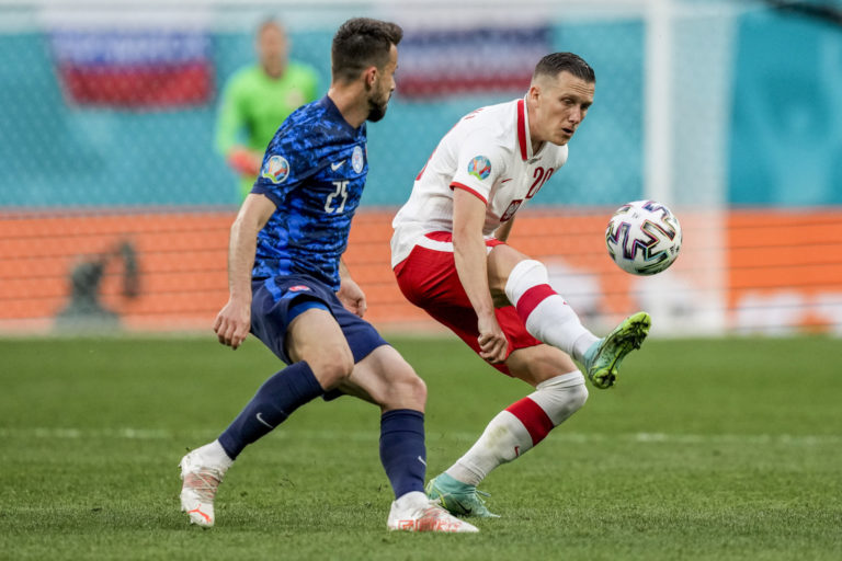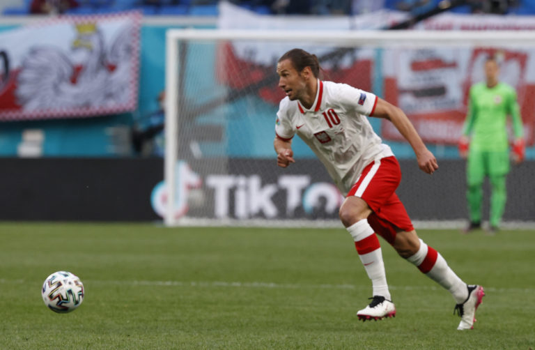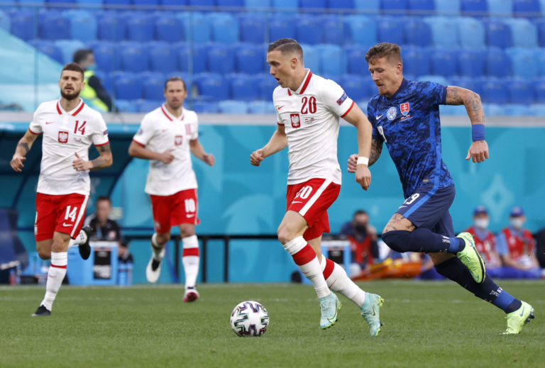 Poľský reprezentant Grzegorz Krychowiak počas zápasu proti Slovensku na ME vo futbale 2020. Petrohrad, 14. jún 2021. Foto: Jevgenia Novoženina/Pool via AP.