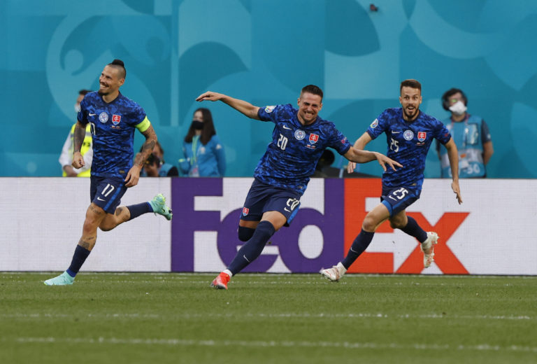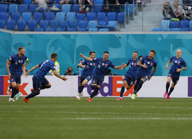 Slovenskí reprezentanti sa tešia z gólu v sieti Poľska v zápase na ME vo futbale 2020, ktorý zariadil Róbert Mak. Petrohrad, 14. jún 2021. Foto: Jevgenja Novoženina/Pool via AP.