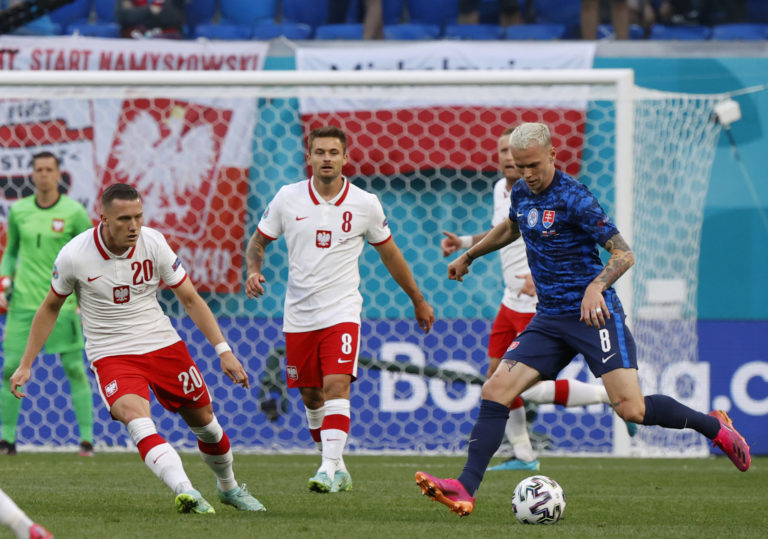 Slovenský reprezentant Marek Hamšík sleduje súboj spoluhráča Ondreja Dudu s Poliakom Kamilom Glikom počas zápasu na ME vo futbale 2020. Petrohrad, 14. jún 2021. Foto: SITA/AP.