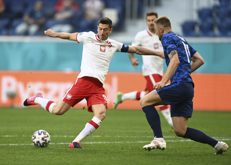 Poľský kanonier Robert Lewandowski počas zápasu proti Slovensku na ME vo futbale 2020. Petrohrad, 14. jún 2021. Foto: Jevgenija Novoženina/Pool via AP.